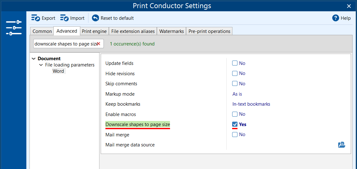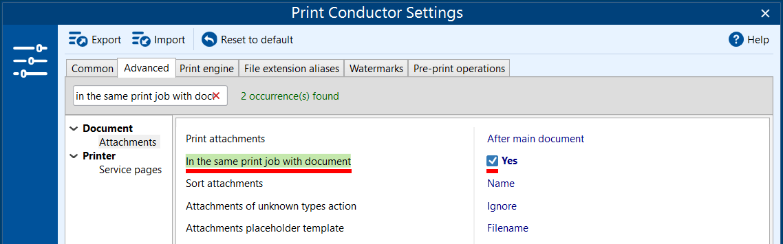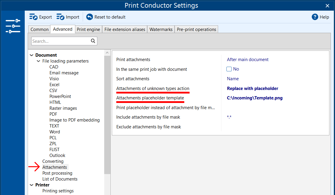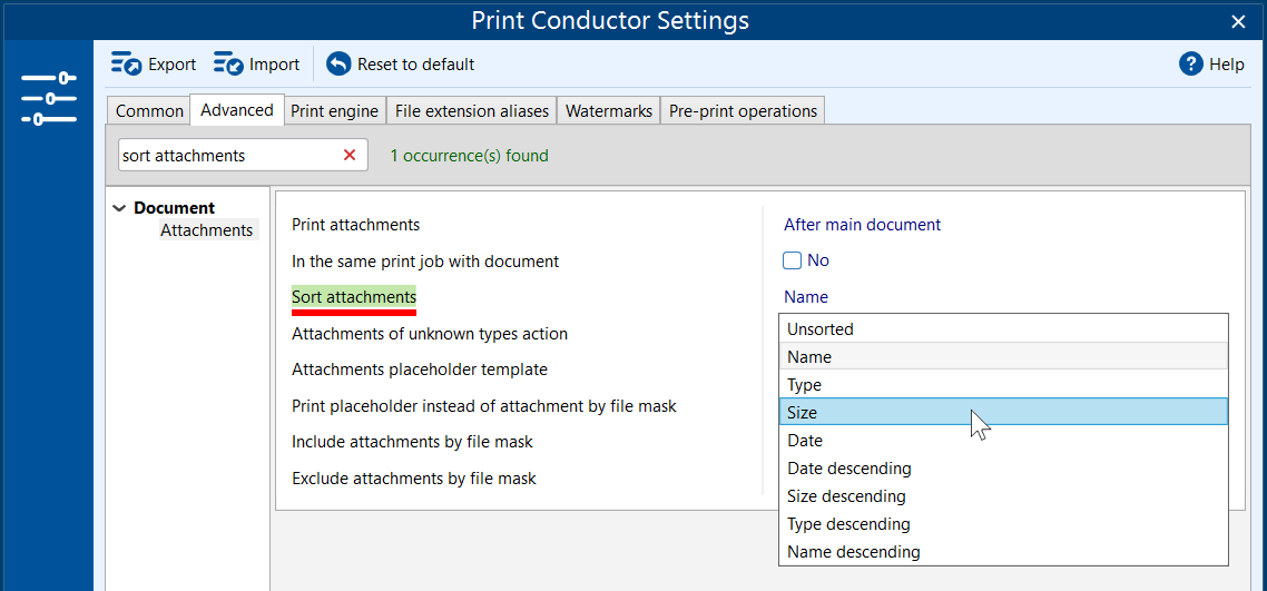 In the Advanced Settings, you can define how file attachments should be printed: after or before a document. You can also set the program to print attachments without the main document or ignore them. Available options are: