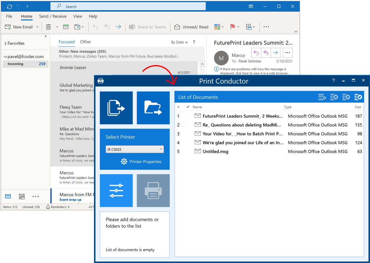 Adding emails to Print Conductor is easy. Simply drag selected messages from the Microsoft Outlook folder ("Inbox", for example) and drop them to Print Conductor's List of Documents. Alternatively, if you have emails located as EML or MSG files on your computer, you can add them to Print Conductor's List of Documents just like any other supported files.