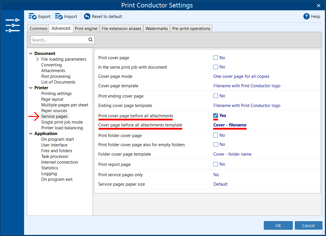 If you need to print a cover page between the email and its attachment(s), you can turn on the Print cover page before attachments setting under the Service pages section. By default, it is set to a blank sheet of paper (Blank), but you can configure it using the Cover page before attachments template setting.
