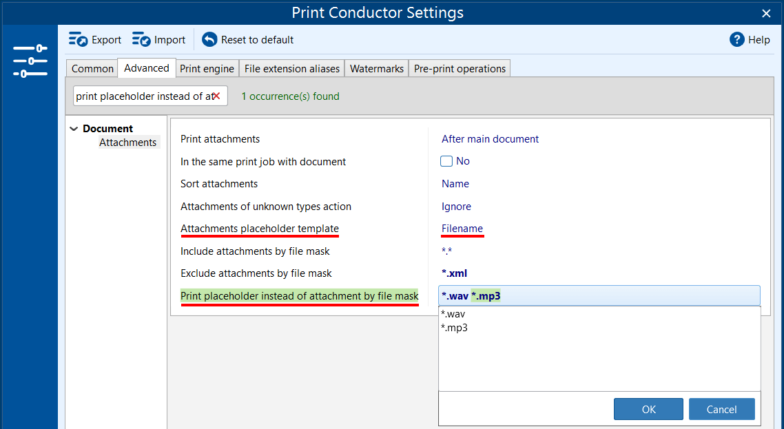 When mass printing emails, there may be situations where attached files are not supported by Print Conductor (such as MP3, WAV, etc.), but they still need to be indicated as attached to the email after processing. In such cases, there are different ways to handle "unknown" attachments.