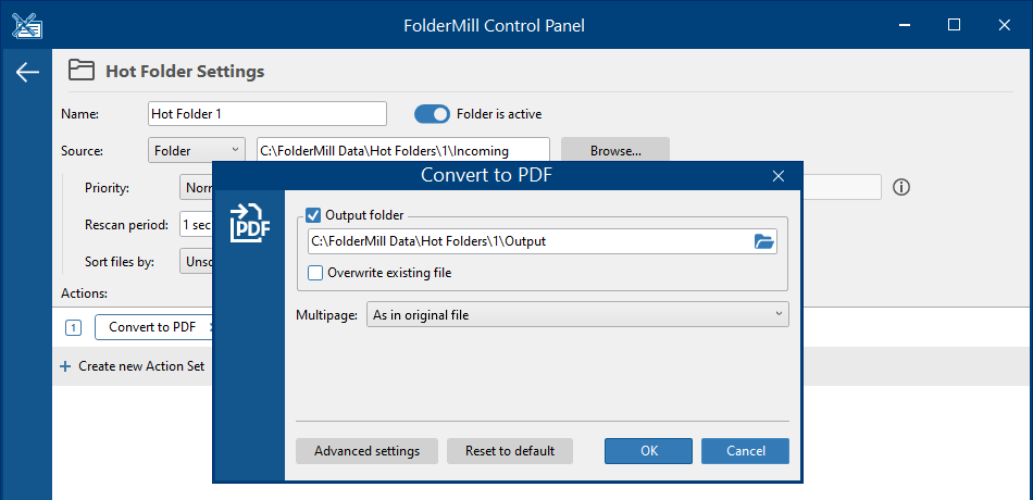 FolderMill will automatically process the documents coming to the Hot Folder and save them in PDF format to a designated folder, based on your settings.