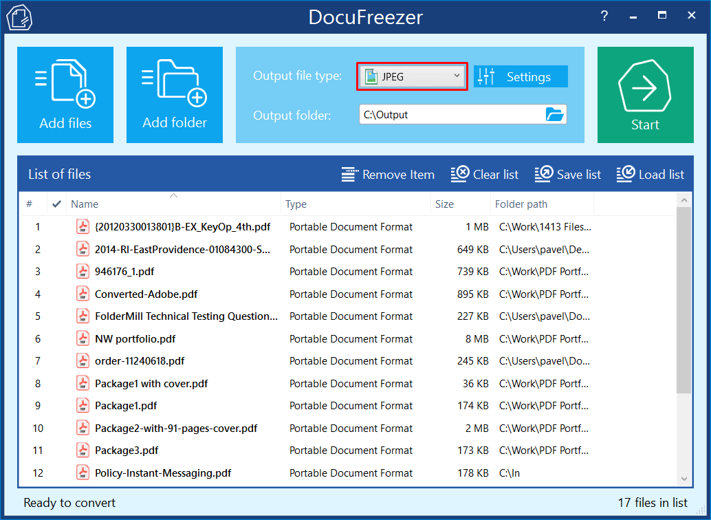- Choose JPEG as the output format (Output file type);