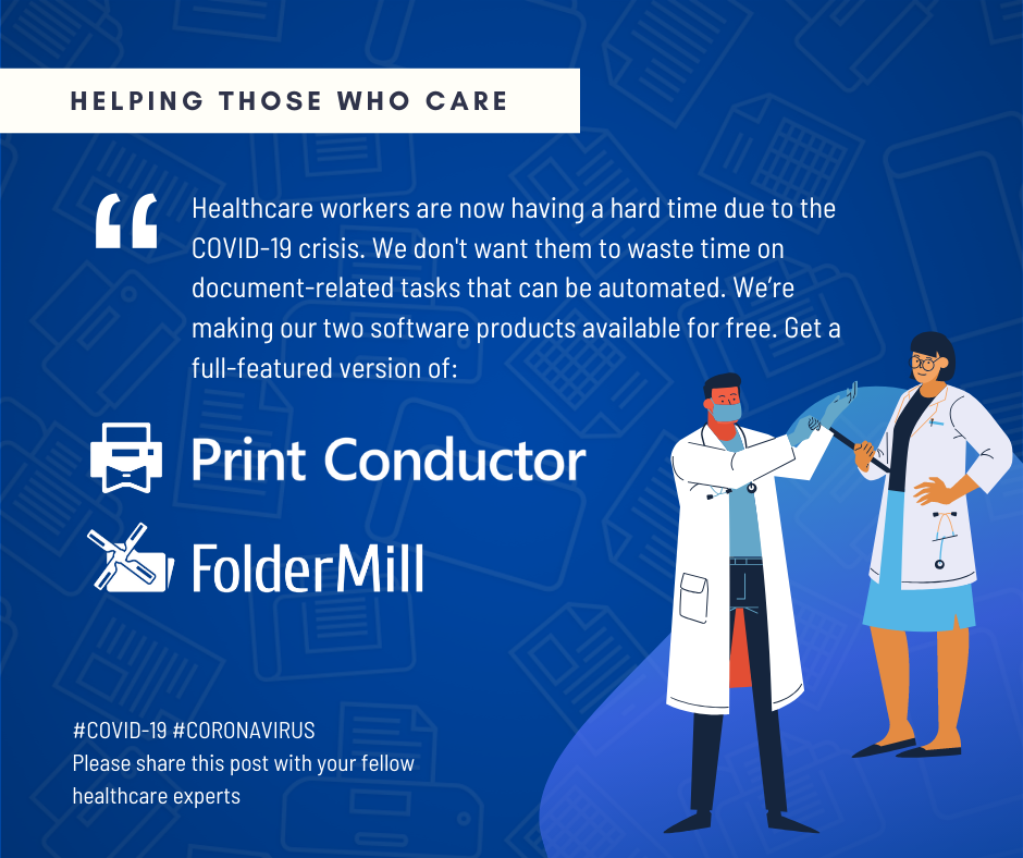 Medical organizations around the world are now eligible to request a full-featured version of our batch printing and automation software free of charge. We offer them our two flagship products for free: Print Conductor and FolderMill.