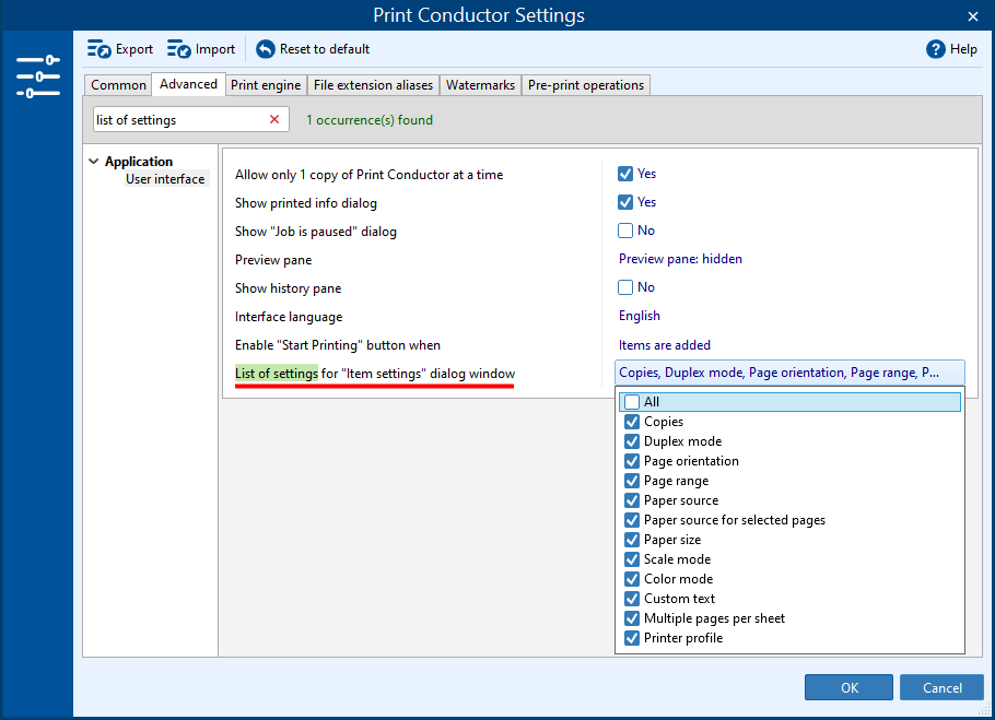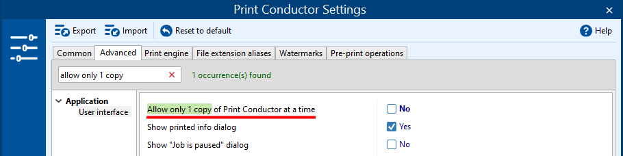- Find the setting Allow only 1 copy of Print Conductor at a time (start typing "allow only" in the search bar) and set it to No;