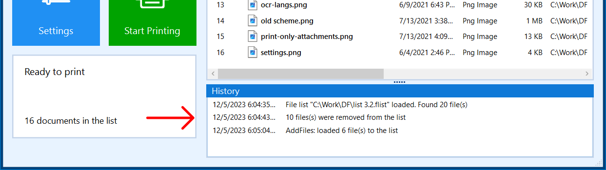 You can view all modifications made to the List of Documents using the History console. This console, located at the bottom of the main Print Conductor window, displays all changes made to the List. To show/hide it, use the Ctrl + H keyboard combination.