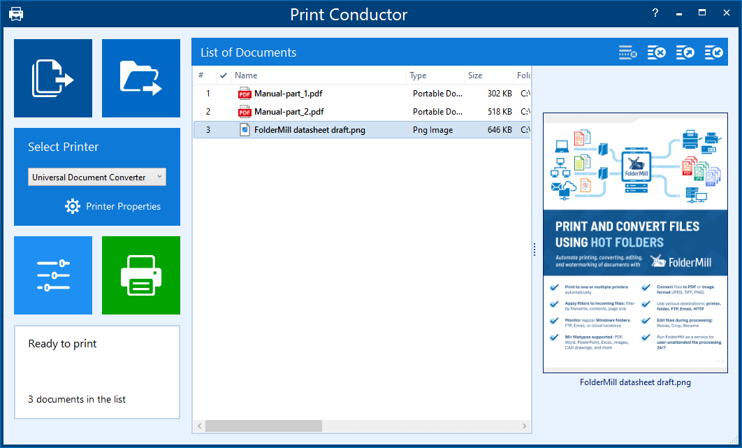 By default, Print Conductor allows you to start batch printing as soon as some files are added to the List of Documents – the Start Printing button turns green and becomes active.