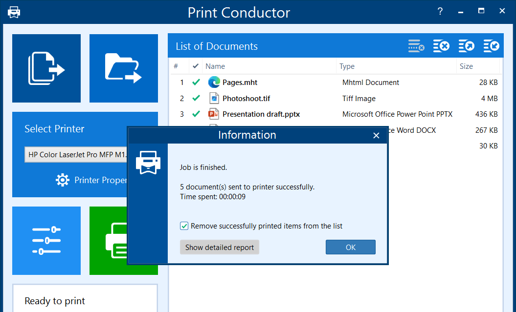 With this dialog enabled, you may also view the Detailed report that will show information about successfully processed files – click the Show detailed report button.