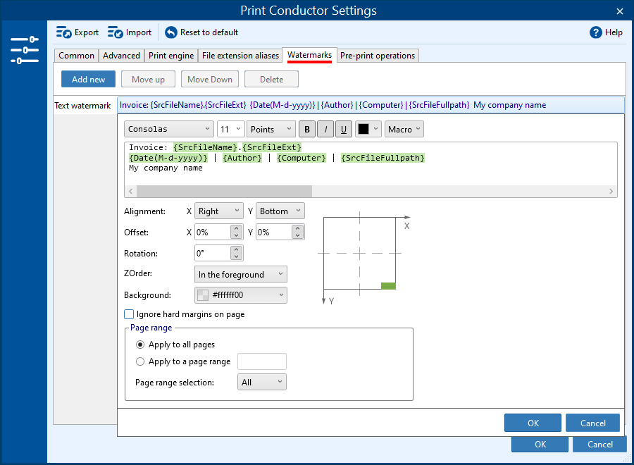 Pour le paramètre filigrane texte (Text watermark), il est possible de saisir n'importe quel texte, d'ajouter des numéros de page ou des métadonnées de fichier source aux pages (par exemple, nom de fichier ou dossier de fichier). Des contrôles de configuration faciles et des macros vous permettent de tout régler selon vos besoins : style de police, alignement, marges, rotation et couleur de fond.