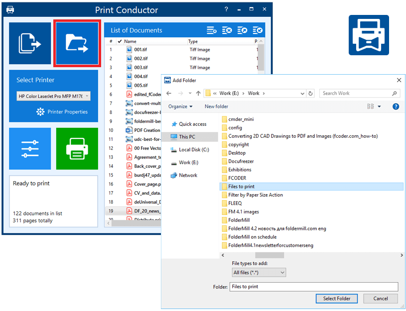 FolderMill is a more flexible and complex system which can not only print but perform other tasks such as convert files, rename or copy them or automatically print many files to different printers. If you just need to add a folder with multiple files and start printing the contents, try using Print Conductor. If you are looking for a solution which allows command line, scheduled or script-based printing from a folder – 2Printer is the right choice.