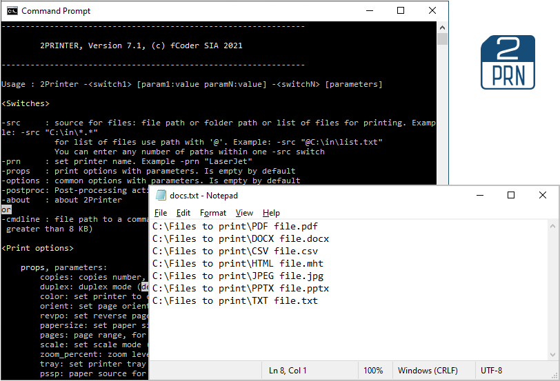 2Printer is a command line tool for printing documents. This software is designed to be used as a printing component in a company or any organization's environment. This tool has no GUI (graphical interface) and is more focused on IT specialists who want to simplify the document workflow.
