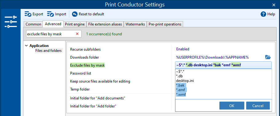 You can exclude certain types of files from being added to the program's list. For example, you have BAK, EMF, WMF, CFG, and XML files in the source folder or archive, but they are not wanted in the List of Documents. To rule them out, go to the Advanced settings and find Exclude files by mask feature. Then add required file extensions you wish to exclude from processing: