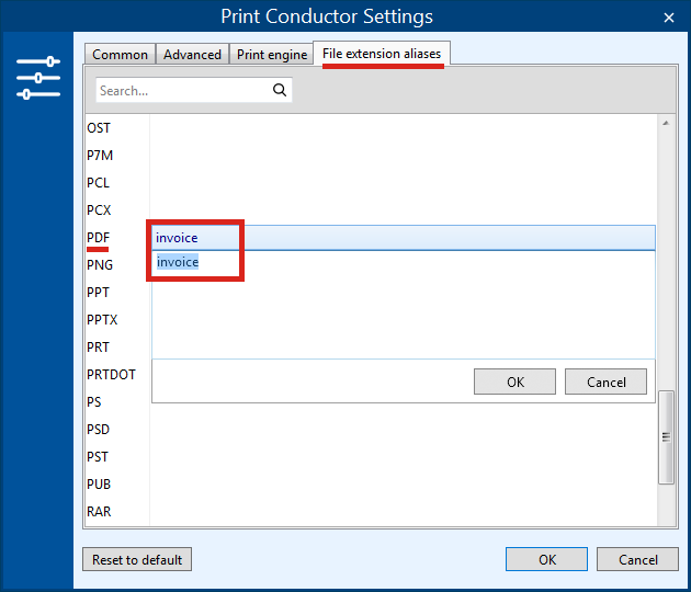 As an example, your software generates [filename].invoice files, which are structurally PDF. Print Conductor does not process files with ".invoice" extension. However, with the help of the File extension aliases tab, it is possible to import and print them – just associate your .invoice files with PDF format. Then your files will be processed the same way as PDF, which is one of the supported file types.