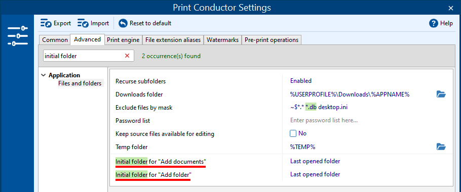 You can customize which folder opens when you click either of these buttons. To configure it, find the Initial folder for "Add folder" and Initial folder for "Add documents" settings in the Advanced Settings and change them. By default, the initial folder is the last opened folder.