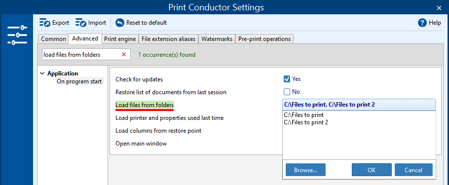 Suppose you have all the necessary files for printing located in a folder (or several folders). In that case, you can get them instantly added to the program. Print Conductor will automatically scan them and import all files into the List of Documents when the program starts.