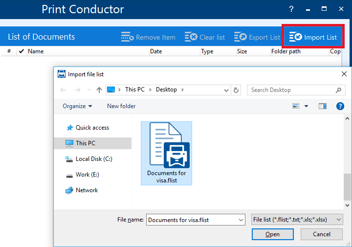 You can also import a list if you already have file paths listed (e.g., a list of file destinations created by another software). On the main window, click the Import List button to import it into Print Conductor.