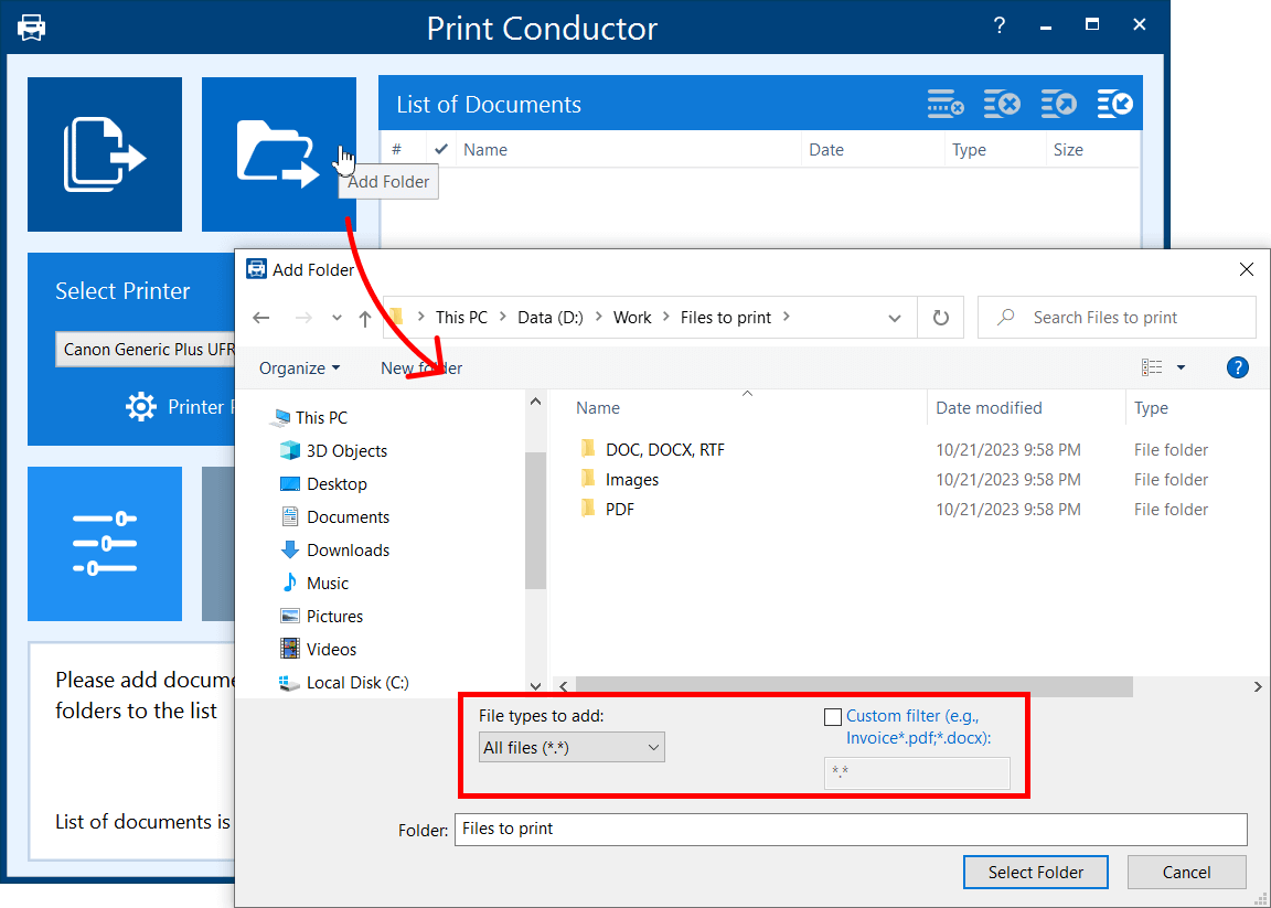 Sometimes you only need to add specific files, not all of them. When selecting a folder of documents to add, you can use "File types to add" or set "Custom filter" settings in the lower part of the window.