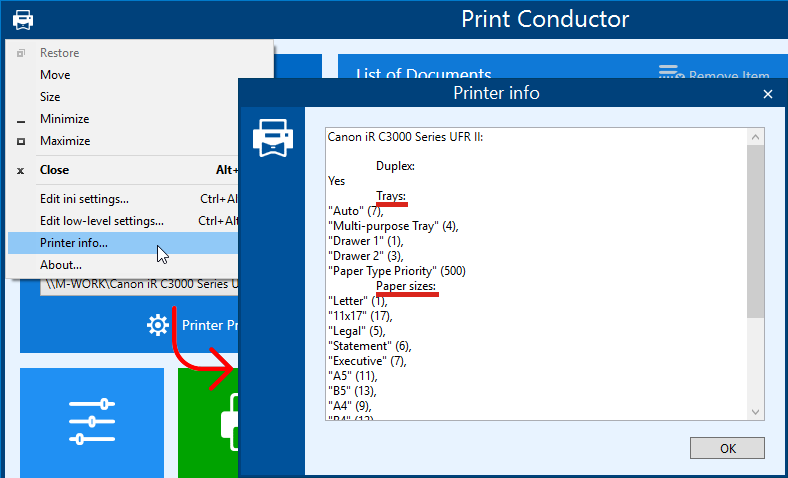 To check available paper sizes and tray names for the current printer, click the Print Conductor logo and select Printer info...