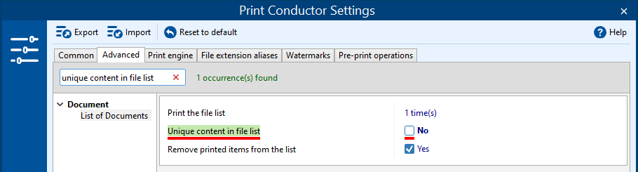 Print Conductor doesn't let you add the same file to the List of Documents more than once with the Unique content in file list setting enabled by default. It helps you avoid a situation when a document is added to the list and printed several times by mistake.