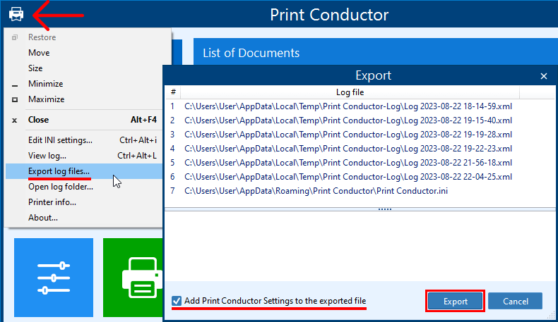 How to export a ZIP file with recent log files and Print Conductor Settings (.ini)