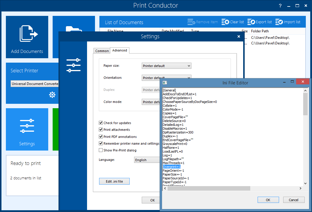 In order to print PDF files using the simulate overprint feature in Print Conductor 5.5, go to Settings, Advanced, Open INI-file (“Edit .ini file”), find line Overprint=0 and change its value to Overprint=1.