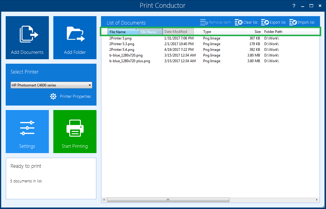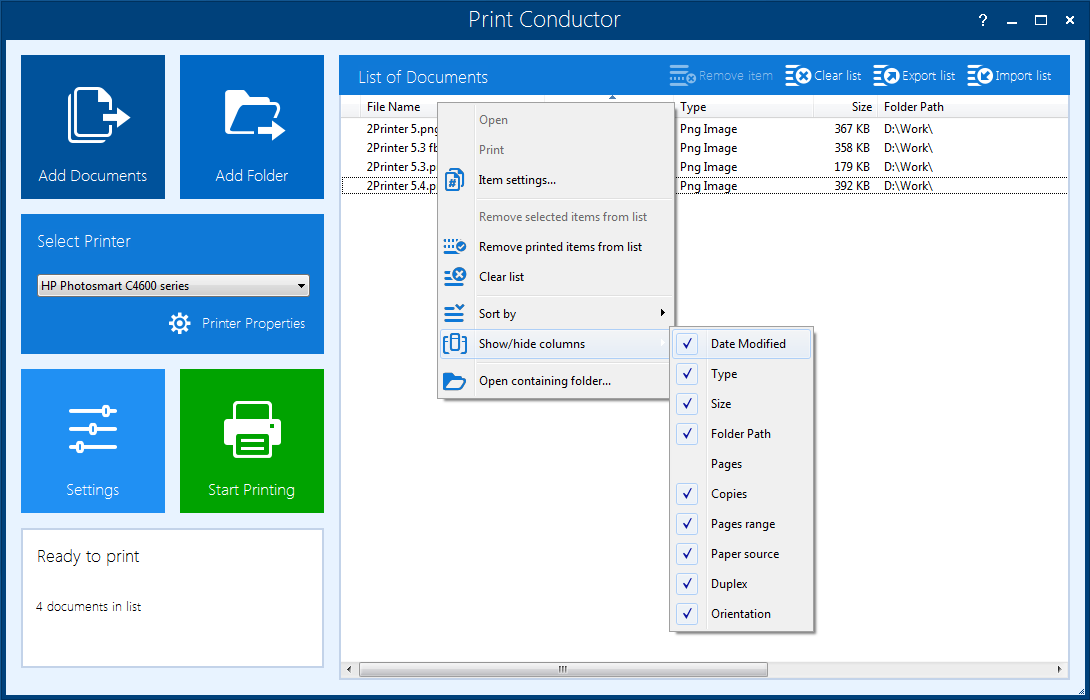 If you have to deal with printing of dozens, hundreds or even thousands documents weekly, Print Conductor can really help you. It can print many files in a row as a batch job. Print Conductor supports over 70 file formats. It takes only three steps to have your files printed without opening each one of them: add documents onto the main window, select printer and click “Start Printing”.