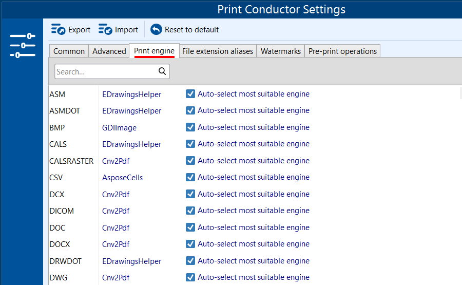 If you disable the Auto-select most suitable engine option, Print Conductor will stick to the selected print engine instead of switching. The print engine in the second column will be applied.