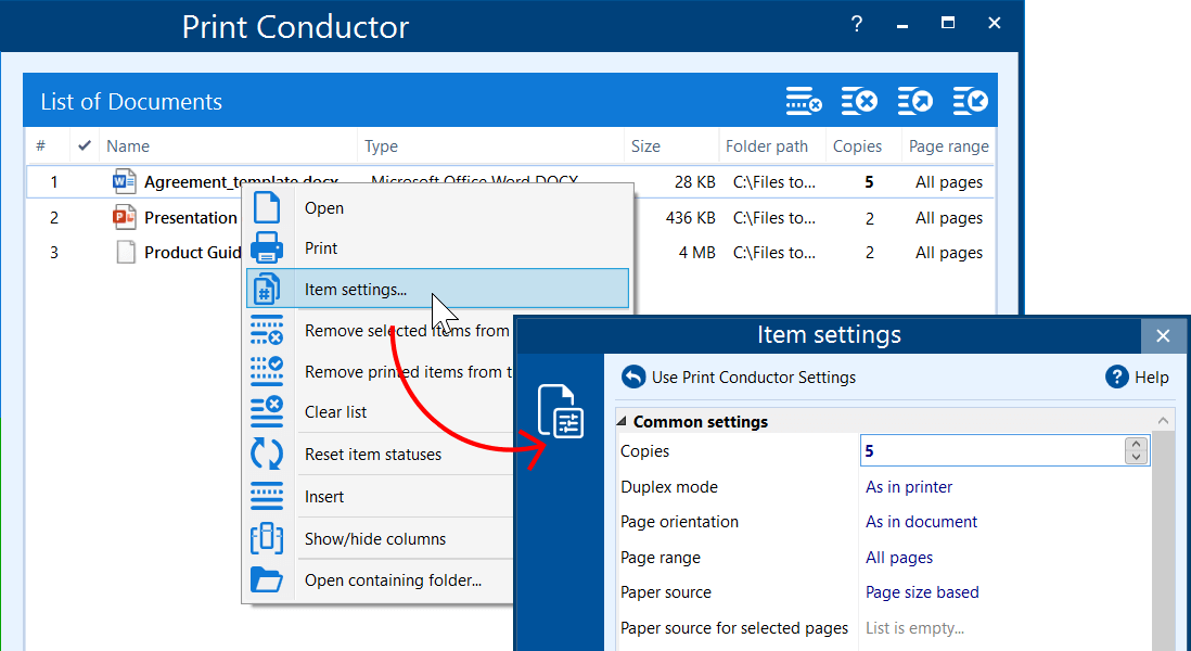 If you need to set a specific number of copies for individual items in the List, you can do so by selecting one or several items, right-clicking them, and choosing Item settings... Here, you can configure the number of copies for one file or a group of selected files.