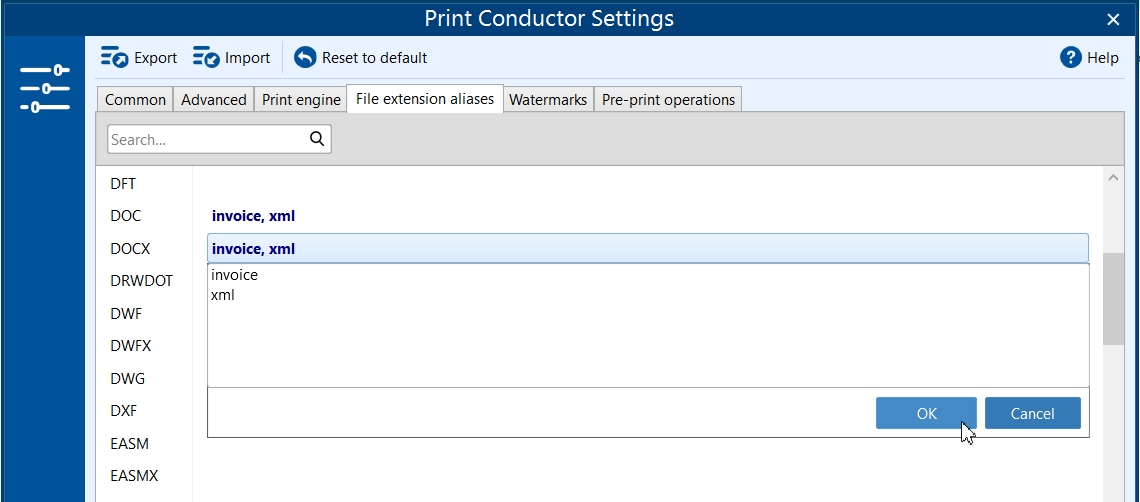 - Open Print Conductor Settings → File extension aliases and click next to the format you want to associate your files with;