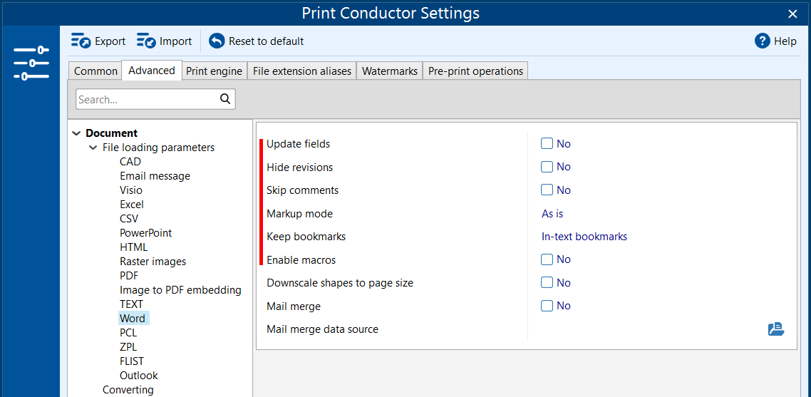 These Word-specific settings can be found in Print Conductor Settings → Advanced → Document → File loading settings → Word.
