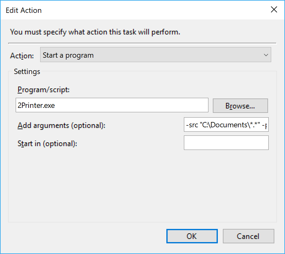 2Printer.exe -src "C:\Documents\*.*" -prn "Canon iR C3000 Series UFR II" -options alerts:noIn the Edit Action dialog window, enter 2Printer.exe below Program/script and paste arguments (the rest of the command) next to Add arguments (optional):