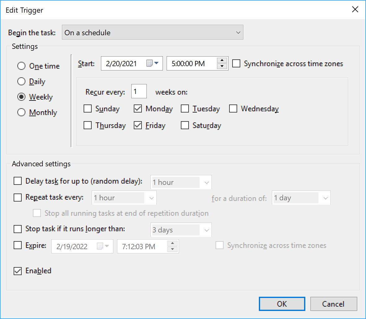 - MonthlyThere are various options here – you can set running your print task at a specific time of day or multiple times on a daily, weekly, or monthly basis.