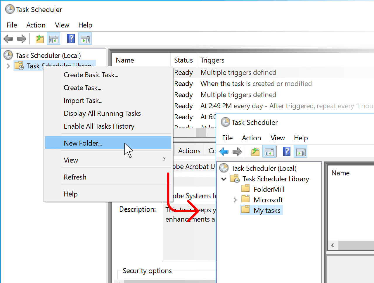 It's a good idea to create a separate location for it first. This way, your print-related tasks won't get mixed with others that run automatically on your computer. To do it, right-click the Task Scheduler Library and create a new folder: