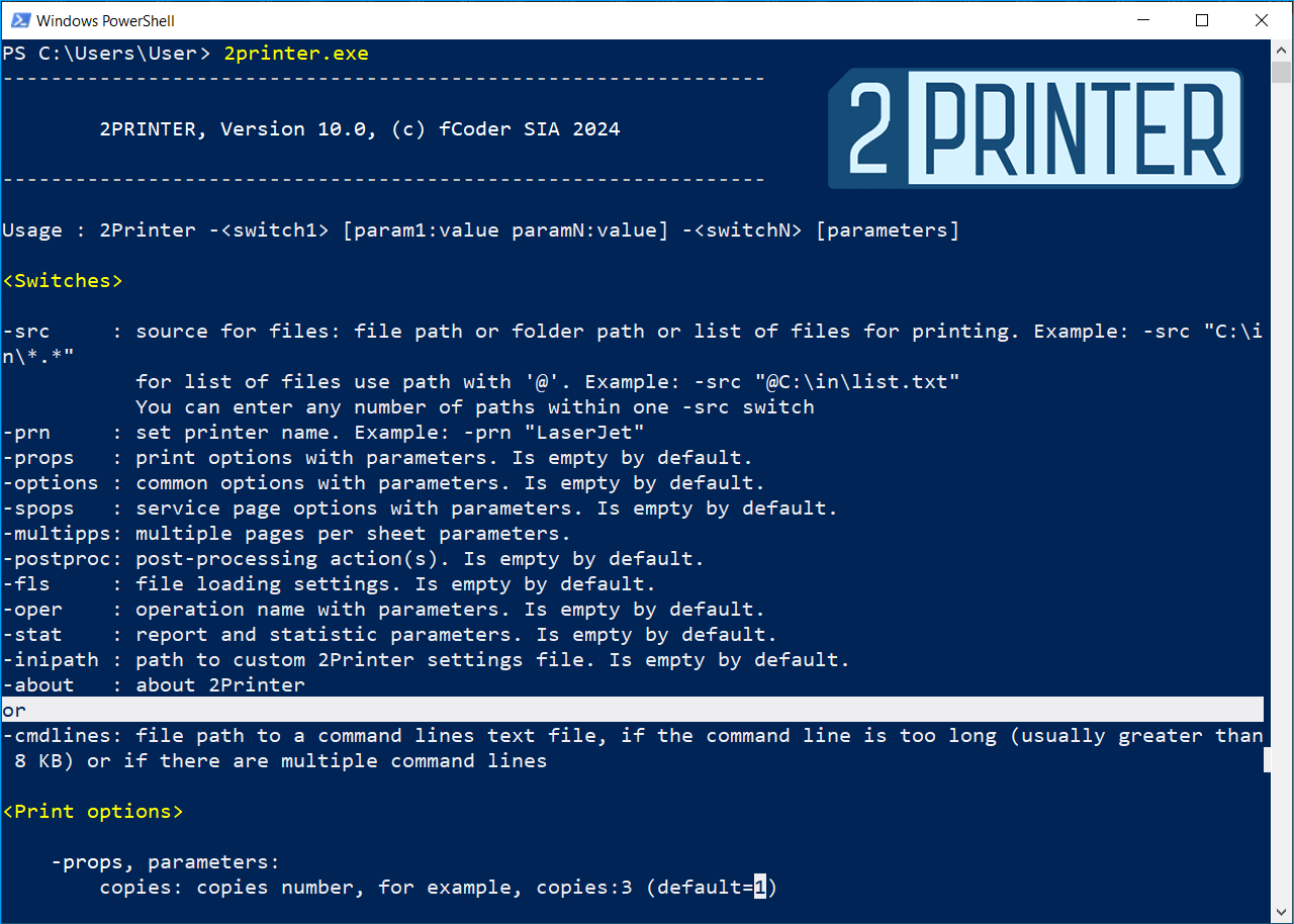 Download the free version of 2Printer for evaluation and personal use. 2Printer is a professional command line batch print utility with a wide variety of print settings. After the installation, you can execute the 2Printer.exe command to see all available switches and parameters.