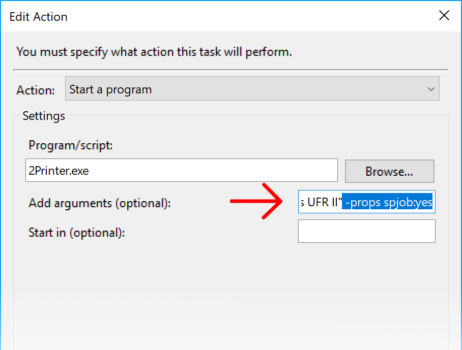 2Printer.exe -src "C:\Documents\*.*" -prn "Canon iR C3000 Series UFR II" -props spjob:yesTherefore, we just add -props spjob:yes to the arguments in the Task Scheduler: