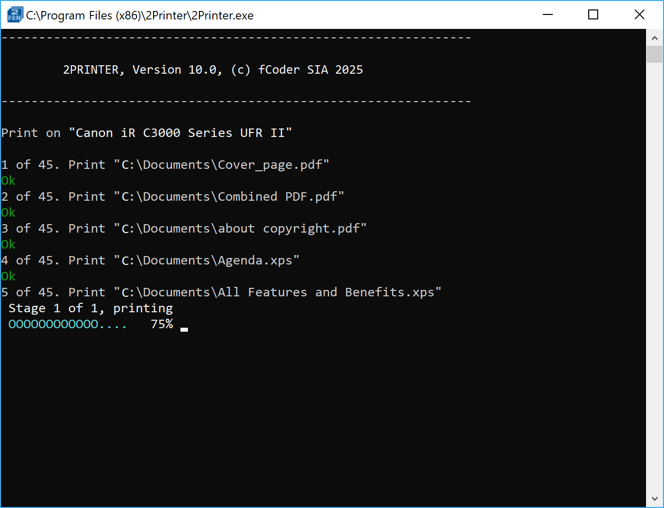 As soon as Task Scheduler's trigger works, 2Printer will start sending all files from the source to the printer – you'll see this window with 2Printer's work in progress: