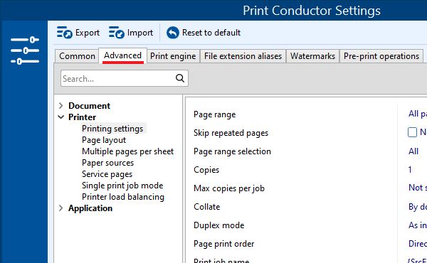 Print Conductor Settings enable you to tailor the program to your requirements. Detailed descriptions of these settings, divided by interface tabs, are provided below.