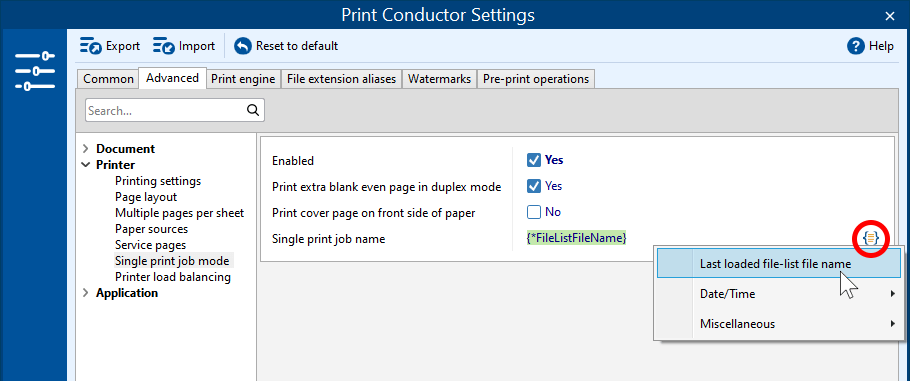 You can use the name of the last loaded File List (.flist, .txt, .xlsx, .xls) instead of the default "Print Conductor's single print job" name. To do this, remove the default name next to the Single print job name setting and insert the macro {*FileListFileName}.