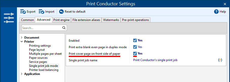 If you use cover pages along with Single print job and Duplex mode, you may experience an issue when the cover page is printed somewhere in the middle (not as first page). To make sure it is always on the first page of paper, turn on the option to Print cover page on front side of paper in the Advanced Settings.