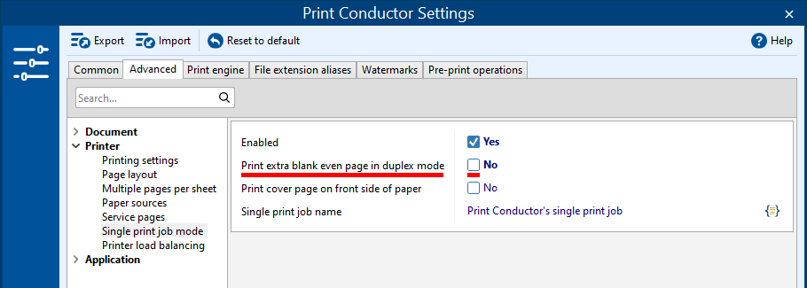 Adding a blank page is enabled by default, but if you want to print the whole set of documents without blank pages in the middle, disable the Print extra blank even page in duplex mode option.