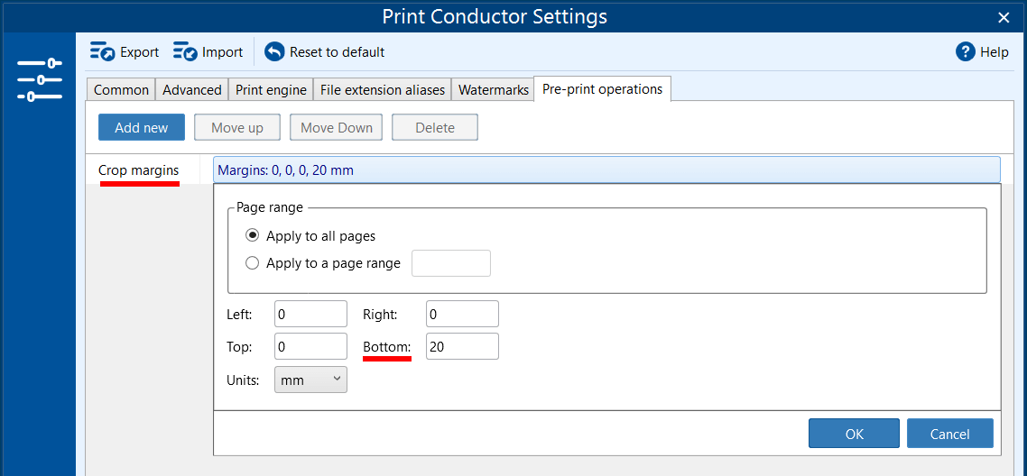 If a white rectangle isn't suitable (for example, if it's too noticeable), try cropping the pages to remove unwanted watermarks. Add a Pre-print operation → Crop margins and set the margins you want to remove. Setting the Bottom value will remove the lower portion of the page.