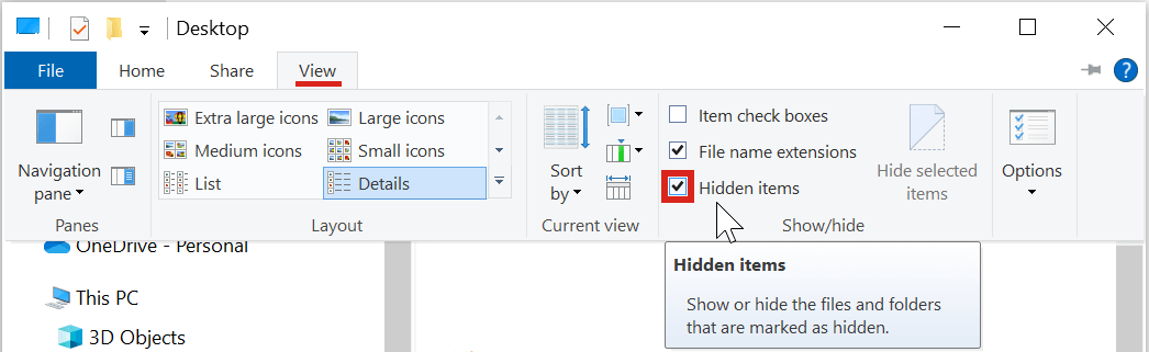 Some files in your folder may be hidden, but you can reveal them. To do it, open the View tab in Windows Explorer and check the box next to Hidden items: