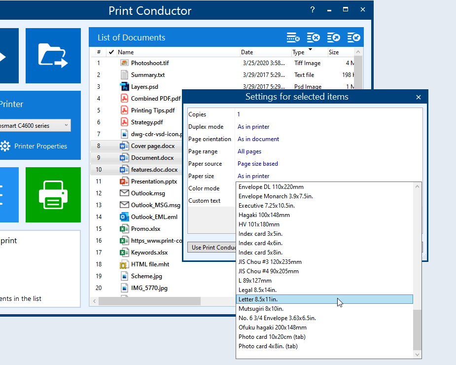 Moreover, you can assign configured Printer profiles to selected files or groups of files and print with specific Printer Properties applied. Learn more: