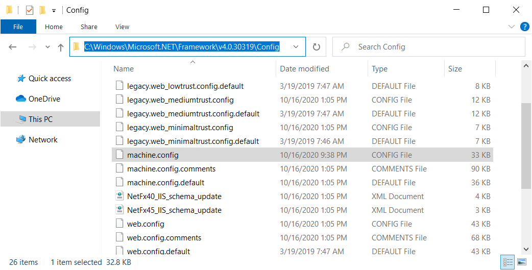 (if it is not found, check that the v4.0.30319 is correct for you)- Right-click the machine.config file and open its Properties;