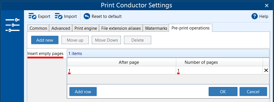 - Add Insert empty pages operation and select one blank page to add after page #1: