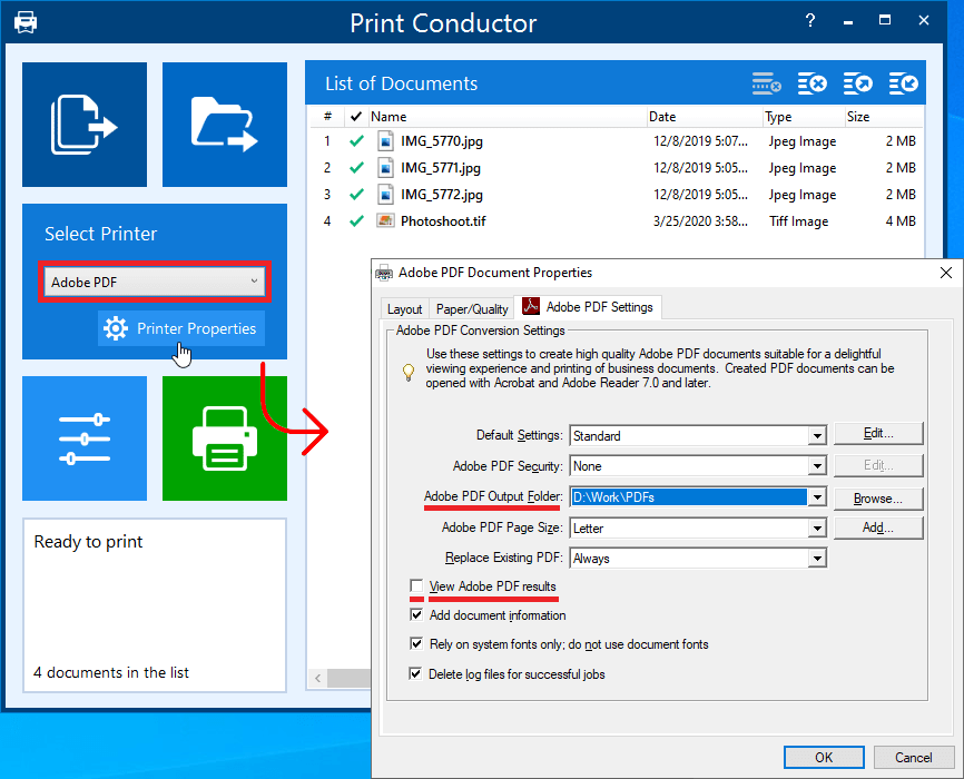 If you have Adobe Acrobat Standard or Pro ("Reader" version will not do), then you most likely have Adobe PDF printer installed. With this virtual printer, you can also mass convert documents to PDF from Print Conductor. To make sure the resultant PDFs don't open and "Save to" prompts don't appear, open Printer Properties and: