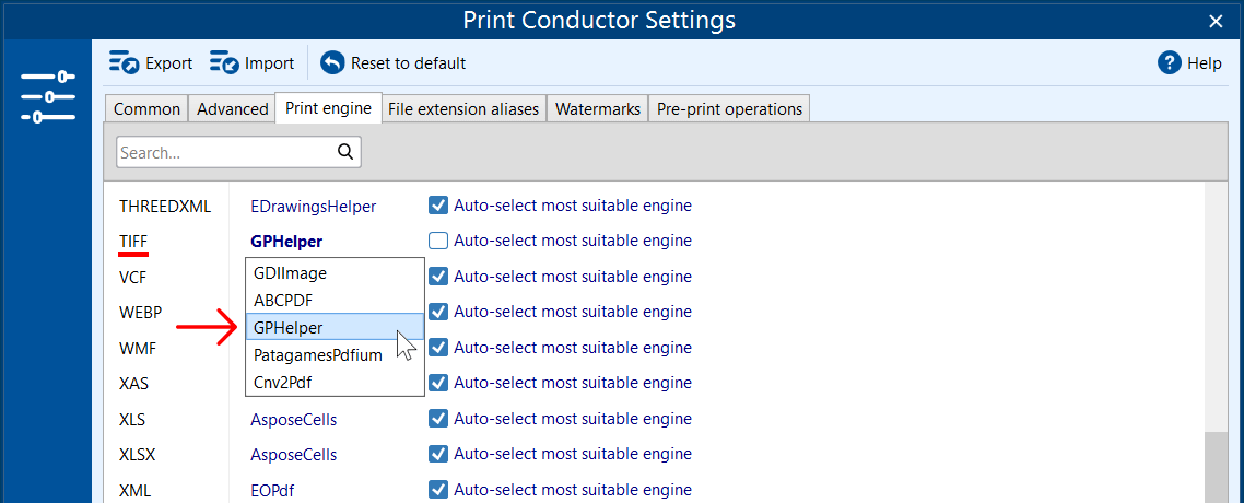- Next to the images you're printing (e.g., TIFF, JPG, PNG, etc.), select GPHelper from the dropdown list;