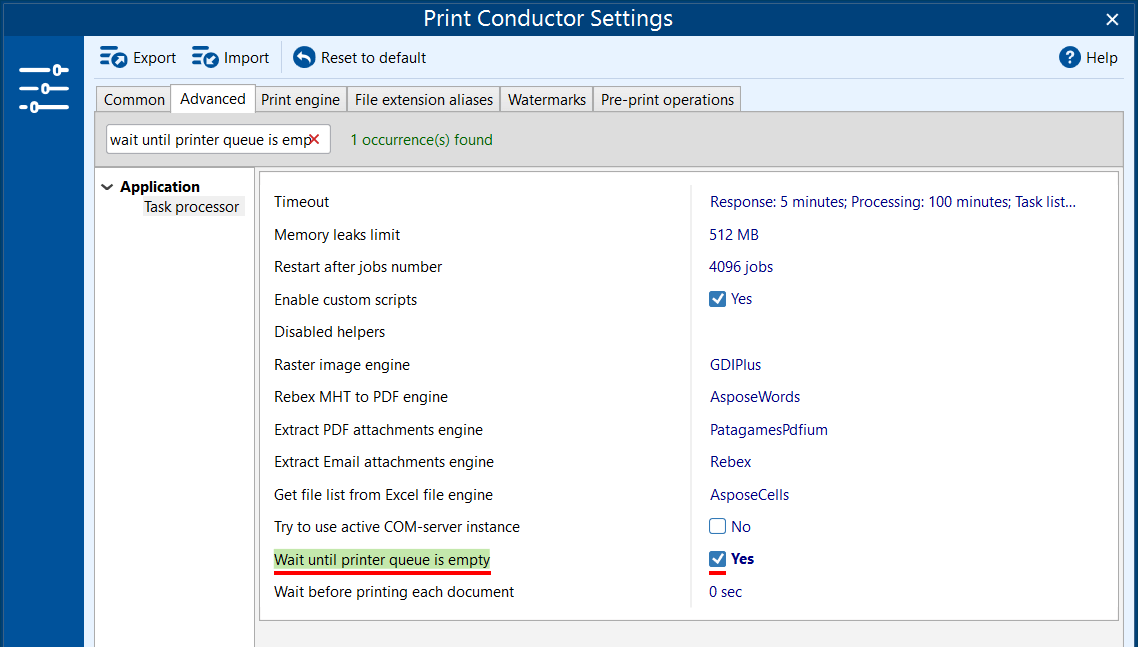 This will force Print Conductor to resume printing only when the printer queue is empty, thus maintaining the strict order of documents. Additionally, this setting allows you to apply finishing options to each document, such as stapling.