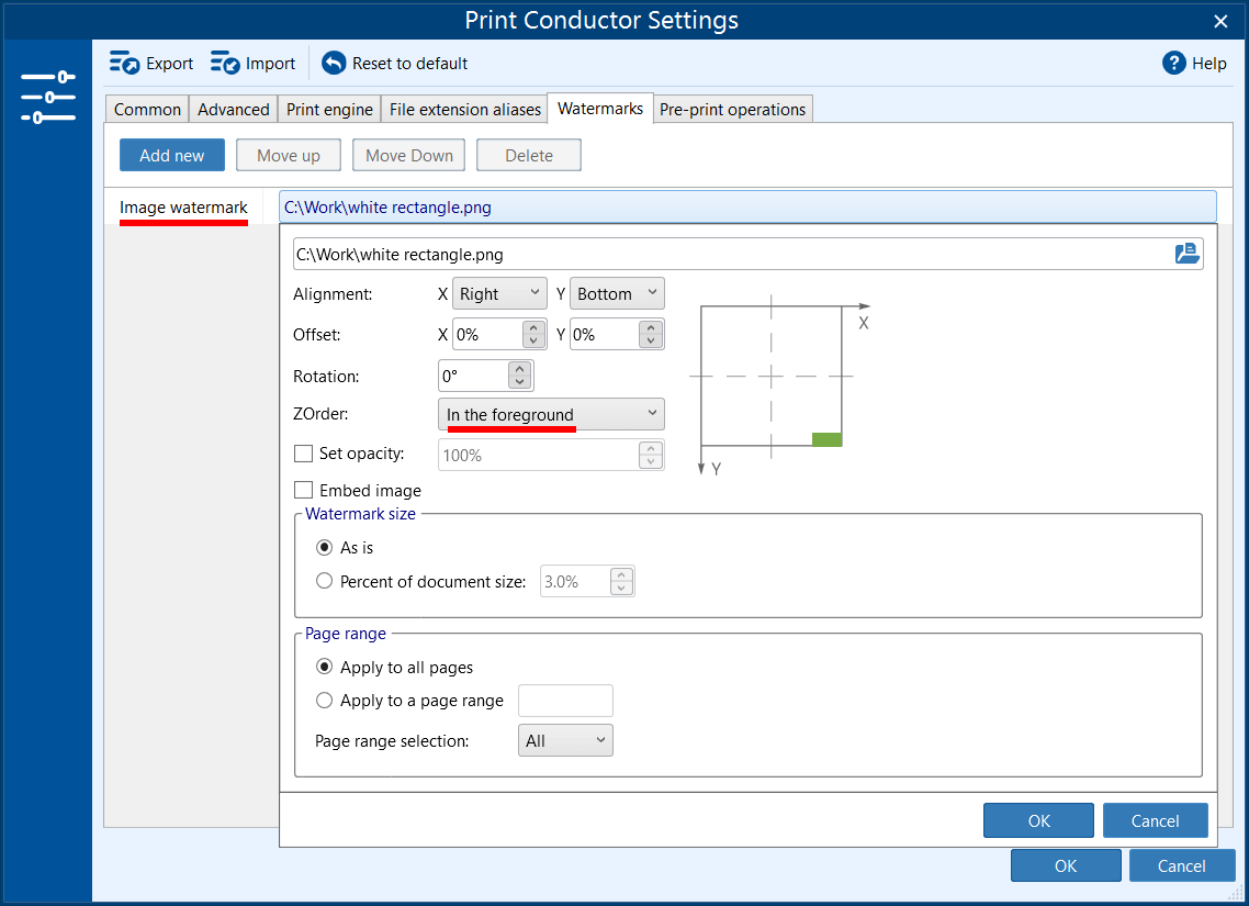If your document pages have white margins, try placing a white rectangular shape on top. Create a simple JPG, PNG, or BMP image in MS Paint and use it as an Image watermark in Print Conductor. Ensure correct positioning — the watermark default position, which can be changed, is to the bottom-right corner and it should appear on top of the page (Z-Order: In the foreground).