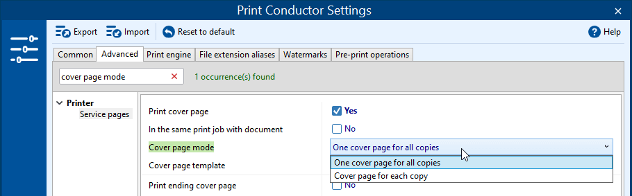 Additionally, you can set the program to insert a separation page per copy of each document – add a cover page between every copy. To do it, find the Cover page mode setting and select the Cover page for each copy option: