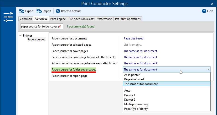For cover pages, you can use the same printer tray as for document or have it pulled from a different tray. Using the Paper source for covers setting, select a certain paper source for your cover page. Possible options are: As in printer, Page size based, The same as for document. Alternatively, you can select an option that is provided by your printer.